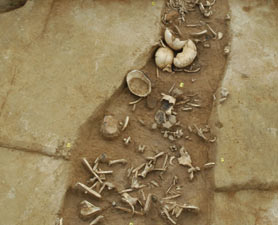 Le ceramiche trovate fra le ossa vennero accumulate in non più di pochi decenni; alcuni pezzi arrivano da siti lontani 400 km. Risalgono al Neolitico, verso i 7500-7000 anni fa, e appartengono alla cultura della ceramica lineare.