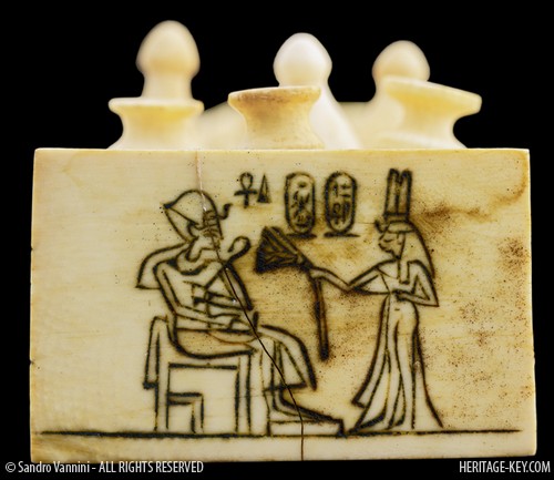 In un lato è incisa l’immagine di Tutankhamon e della sua regina Ankhesenamon (o Ankhesepaaton) che offre un fiore di loto.