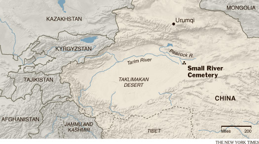 Il cimitero, noto come Small River Cemetery No. 5, giace vicino al letto di un fiume essiccato, nel bacino del Tarim – una regione circondata da catene montuose così inospitale da essere evitata anche dai successivi viaggiatori sulla Via della seta.