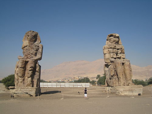 I famosi Colossi di Memnone, due statue di pietra alte 18 metri raffiguranti Amenhotep III, sono tutto ciò che rimane del tempio funebre, una volta uno dei più grandi complessi religiosi d’Egitto.