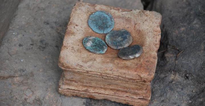 Un piccolo altare di ceramica con quattro monete romane. Forse aveva uno scopo rituale (Rossella Lorenzi)