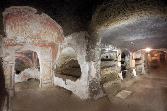 Nella volta del cubicolo, grande due metri per due, ci sono anche le immagini di una matrona romana (probabilmente la donna lì sepolta) insieme alla figlia e con un rotolo in mano (simbolo di cultura e sapienza) e di “un fitto cassettonato che forse imitava la basilica di San Paolo”.