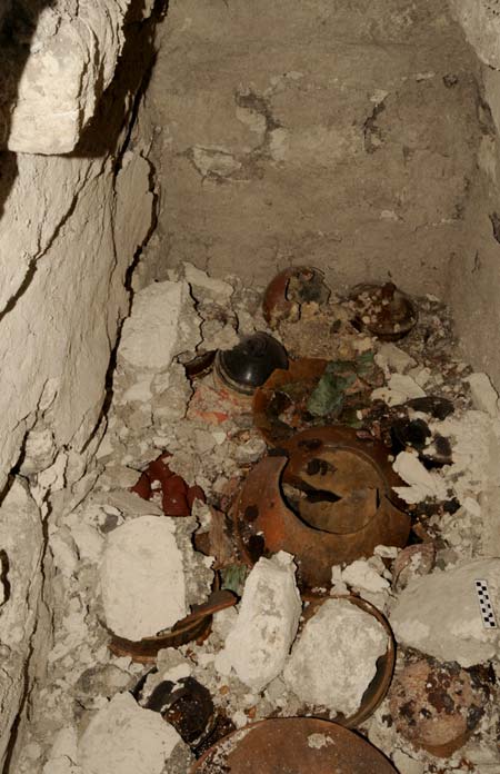 Perfettamente conservata per oltre 1600 anni, vi era una tomba piena di pezzi di legno, tessuti, sottili strati di stucco dipinto e diverse ceramiche.