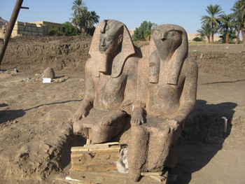 Nel tempio funerario di Amenhotep III (1390-1352 a.C.), a Kom el Hettan (Luxor, Egitto) è stata scoperta la parte superiore di una doppia statua di granito rosso che ritrae il faraone insieme al dio-Sole Ra-Horakhti.