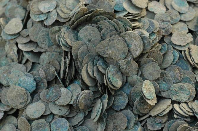 Sepolte in una fossa sigillata con delle piastrelle, vi erano circa 100.000 monete romane risalenti alla fine del III secolo d.C. Si tratta di monete di bronzo molto piccole, ciascuna pesante all’incirca 0,4 grammi, per un totale di circa 38 kg.