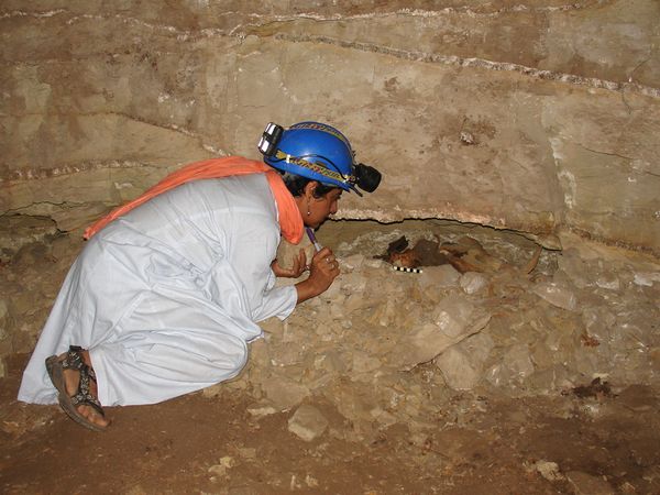 L’archeologa Ikram osserva da vicino un cane mummificato in una nicchia della catacomba, probabilmente corrispondente a un ruolo speciale dell’animale in vita.