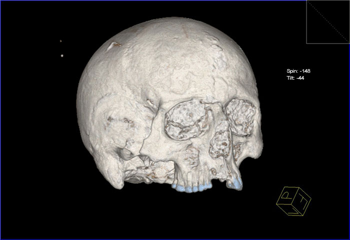 Le fratture sulla seconda vertebra del collo suggeriscono un qualche tipo di trauma prima della morte dell’uomo, mentre un gruppo di circa nove segni da taglio orizzontali fatti con uno strumento a lama sottile, come un coltello, si possono vedere sulla parte anteriore del cervello.