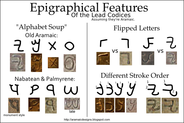 Se qualcuno avesse un minimo dubbio sull’autenticità dei codici di piombo, tutte le altre prove che ne dimostrano la falsità sono state linkate sul blog PaleoJudaica e anche su A’ goula Blogger (e francamente sono così tante e schiaccianti che si spera di non sentire più questa storia).