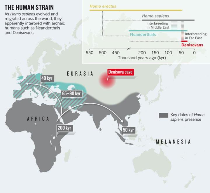 Da allora, gli scienziati hanno arricchito di dettagli una delle più grandi sorprese dal genoma di Neandertal, cioè che gli esseri umani che vivono al di fuori dell’Africa devono fino al 4% del loro DNA ai Neandertal. Una spiegazione potrebbe essere che gli uomini moderni si incrociarono coi Neandertal dopo aver lasciato l’Africa, forse in Medio Oriente, prima che la loro prole migrasse in Europa e Asia.