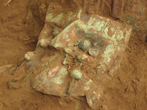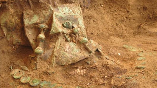 Insieme al corpo vi erano oggetti funerari in ceramica, un pettorale di rame, uno stemma, uno scettro di rame e argento, una maschera funebre di rame e una corona di rame e argento.