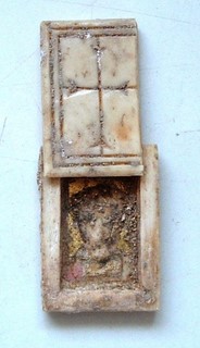 Rimosso il coperchio, sono ancora visibili i resti di due ritratti. Le figure, un uomo e una donna (quasi invisibile, sul retro del coperchio), sono probabilmente santi cristiani, o – forse – anche Gesù e la Vergine Maria.