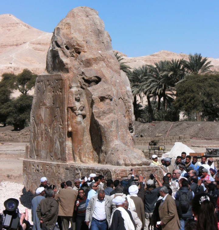 Una statua colossale di Amenhotep III in quarzite è stata sollevata nel suo luogo originario dai membri del “The Colossi of Memnon and Amenhotep III temple conservation project“, un team euro-egiziano che lavora per la conservazione del tempio funerario di Amenhotep III a Luxor dal 1998.