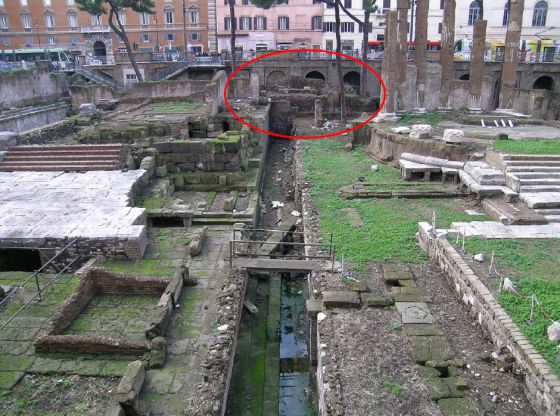«Se dalla strada dove è la stazione del tram ci si affaccia sui ruderi, si osserva, subito al di sotto e dietro al tempio rotondo, un muro che ingloba una nicchia, dalla quale spunta un pino. È la nicchia del salone (440 metri quadrati) in cui era alloggiata la statua di Pompeo, ai piedi della quale cadde Cesare. Muro e nicchia sono il retro della Curia di Pompeo, che per il resto si estende sotto la strada».