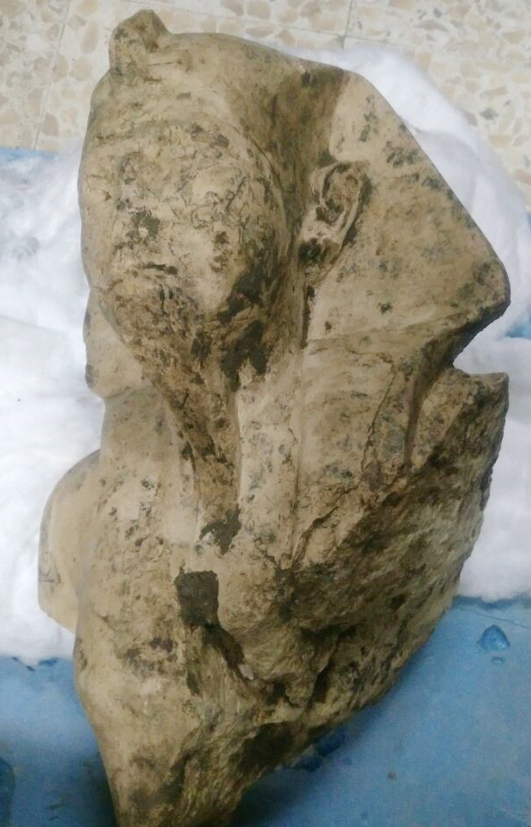 La missione ha trovato due pezzi della statua: il primo è una parte della corona, il secondo è una grande parte del corpo e pesa 7 tonnellate. Il primo pezzo rappresenta una buona parte della testa, con la corona, un bellissimo e completo orecchio destro e una parte dell’occhio destro. La missione ha utilizzato una terna per l’estrazione, e questo è stato un atto legittimo al 100% in quanto le terne vengono utilizzate in tutte le aree archeologiche.