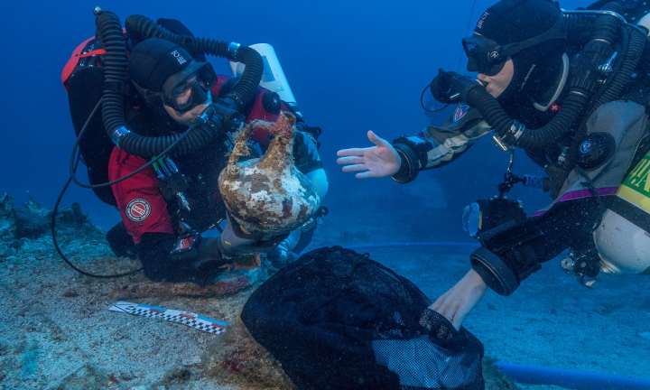 I manufatti erano intrappolati sotto alcuni massi in una parte inesplorata del mare davanti all’isola di Anticitera, in Grecia. I ricercatori pensano che gran parte di almeno sette statue siano ancora sepolte nelle vicinanze.