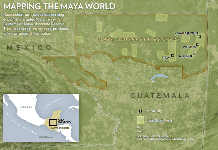 Il lidar era stato utilizzato per la prima volta in archeologia nel 1985 in Costa Rica, ma solo nel 2009, quando i ricercatori lo usarono in Belize, venne impiegato nel territorio dei Maya. La nuova ricerca è la prima fase della “PACUNAM LiDAR Initiative”, un progetto triennale che prevede la mappatura di 14 mila chilometri quadrati di bassopiani del Guatemala. Al momento le indagini aeree hanno scansionato 2.100 chilometri quadrati della “Maya Biosphere Reserve”, nella regione del Petén: 10 aree separate, alcune delle quali erano state mappate a mano e altre erano in gran parte inesplorate.