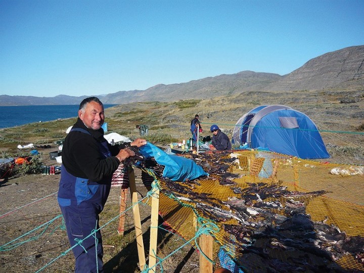 Looking west from the valley of Itineq towards the head of the fjord of Maligiaq (Jens Fog Jensen)Camp by lake Tasersuaq. Caribou meat is dried on racks (Kristian Kreutzmann)