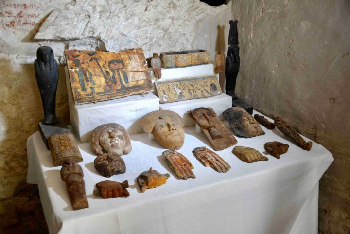 Le maschere funerarie e le due statuette lignee (Ministero delle Antichità d’Egitto)