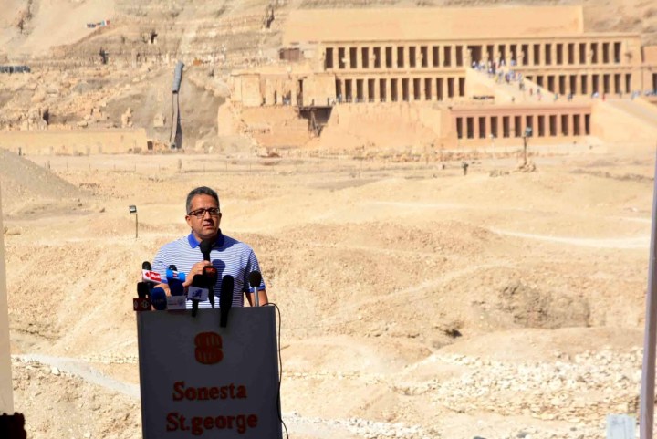 Il ministro delle Antichità Khaled El-Anany durante la conferenza stampa, davanti al tempio di Hatshepsut (Ministero delle Antichità d’Egitto)