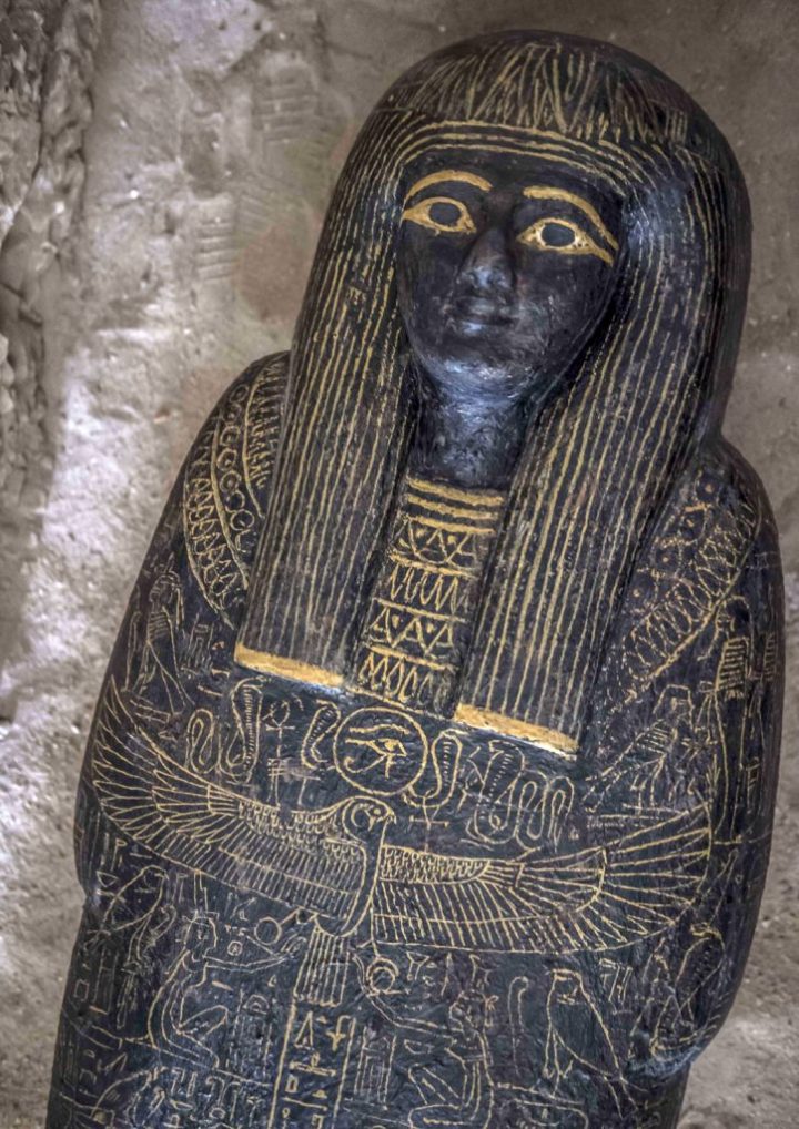 Gli scavi di settembre hanno poi scoperto una stanza laterale che era stata sigillata con mattoni di fango. All’interno vi erano due sarcofagi in legno antropomorfi, con ancora le offerte di fiori sopra e in perfetto stato di conservazione. Risalgono al Periodo Tardo (dinastia XXV o XXVI, VII-IV secolo a.C.) e appartengono a Padiset, un sommo sacerdote di Amon, e a sua moglie Nesmutamu, “Cantante del dio Amon”. Le bare sono nere con splendide decorazioni dorate, come gli occhi intarsiati con lamine d’oro. Le mummie sono molto ben conservate.