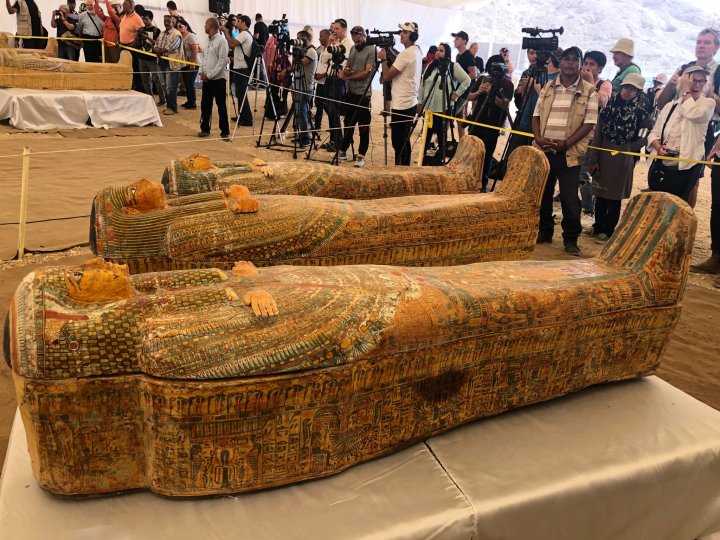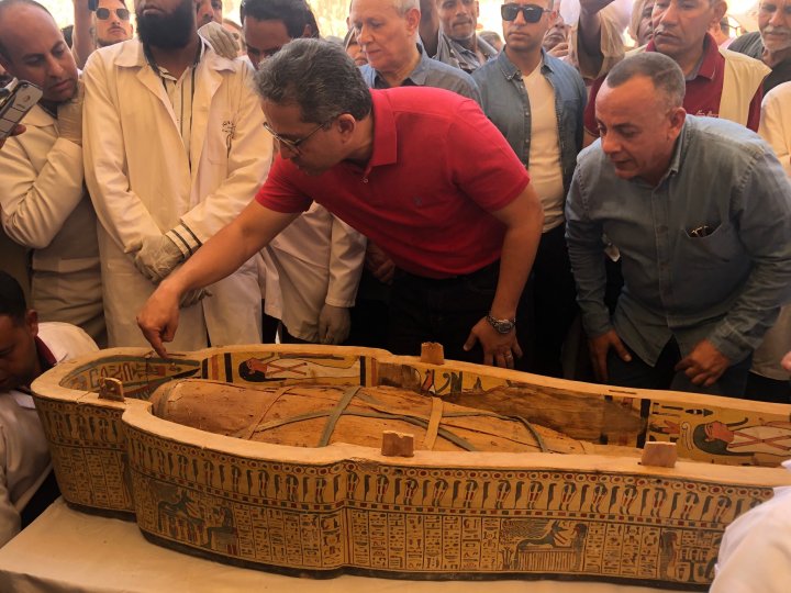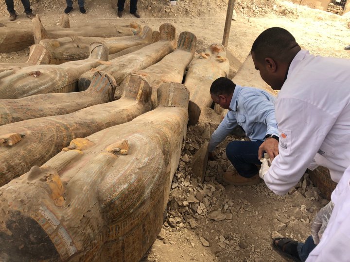Durante la conferenza stampa di sabato, gli archeologi hanno aperto le bare di un maschio e di una femmina adulti. Le due mummie sono sembrate ben conservate: gli involucri esterni erano ancora intatti e coprivano completamente i volti e i corpi. Non c’era alcun manufatto, ma è possibile che fossero stati avvolti negli involucri. Lo scavo è ancora in corso e gli archeologi stanno decifrando i geroglifici: i dipinti sul legno sono così ben conservati che si possono distinguere le divinità e le scritture, le scene dal Libro dei Morti e i titoli dei defunti. L’analisi potrebbe identificare e datare esattamente queste persone. A novembre, le bare saranno spostate da Luxor al Cairo per essere restaurate e infine esposte presso il Grande Museo Egizio, che dovrebbe aprire il prossimo anno vicino alle piramidi di Giza.
