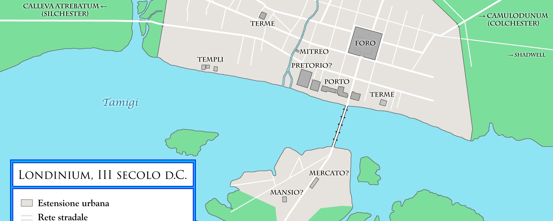 L’antica città di Londra fu un’invenzione dei Romani su un sito molto promettente. L’esercito romano che invase la Britannia nel 43 d.C. probabilmente attraversò il Tamigi nei pressi di Westminster e qui si accorse della felice posizione di alcuni insediamenti britannici. Il fiume era più stretto, adatto sia alla costruzione di un porto sia di un ponte, dove oggi vi è il London Bridge.