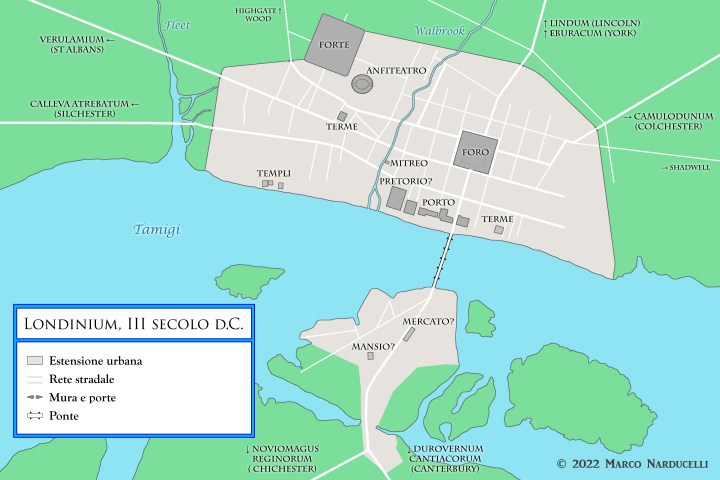 Nel corso di un secolo, Londinium diventò una ricca città, completa di foro, anfiteatro, terme e templi. Era situata nel cuore della Britannia romana, collegata al Mare del Nord grazie al Tamigi e alle principali città tramite uno straordinario sistema di strade che ancora oggi è ricalcato da molte autostrade inglesi.