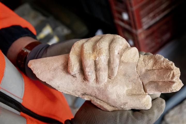 Quando nell’Ottocento l’architetto Viollet-le-Duc ricostruì la volta della crociera e la guglia della cattedrale, proprio sopra il nostro scavo, ne approfittò per dotarlo di reti di riscaldamento, grandi condotti in mattoni che fece passare sotto il pavimento. Scoprì allora otto frammenti lapidei di un pontile-tramezzo (jubé, una sorta di muro sormontato da un palco, ndr), ovvero una “recinzione” che separava il coro dalla navata, i sacerdoti dai fedeli. Alcuni frammenti sono esposti al Louvre. Con nostro stupore, ad appena dieci centimetri sotto la superficie del suolo, sono apparsi da cinquanta a cento frammenti di questo jubé, e potrebbero essercene anche di più. Per una ragione che ignoriamo, questa struttura del XIII secolo, smantellata nel XVIII secolo, era conservata qui in pezzi. Abbiamo già trovato due teste, mani, piedi, colonnine in pietra, dipinte in vari colori, alcune con foglia d’oro, altre in blu, con lapislazzuli. Una scoperta eccezionale secondo gli specialisti. È inaspettata e straordinaria per la quantità di questi frammenti, per l’ottimo stato di conservazione e per la qualità delle sculture. Bisognerà avviare studi, che forse permetteranno una riproduzione digitale, in 3D, di questa monumentale recinzione.