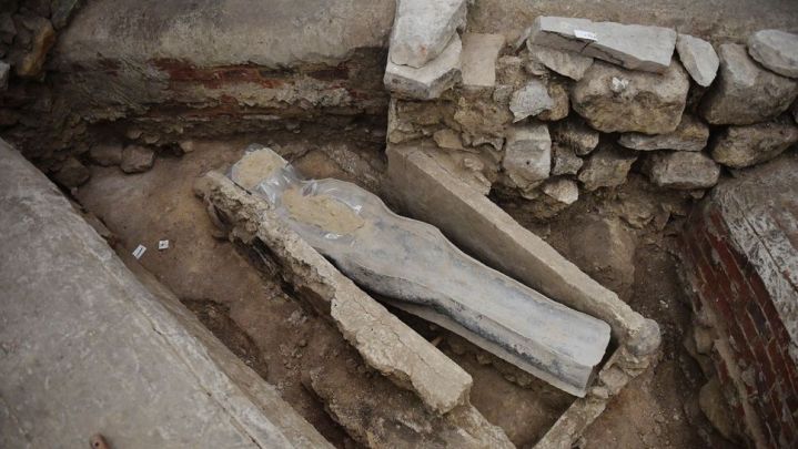 Questo materiale era riservato a un’élite, quindi è probabile che si tratti di un ecclesiastico o di un laico di alto rango. C’erano tre perforazioni, una a livello della testa, due a livello del torso: fortunatamente, una troupe cinematografica presente sul posto per filmare gli scavi ci ha prestato una telecamera endoscopica, che ci ha rivelato lo scheletro. E, sotto il cranio del defunto, un piccolo cuscino di foglie, forse di bosso o di alloro, oltre a frammenti di materiale tessile e materia organica sulle ossa. Ma non avremo informazioni affidabili, né saremo in grado di identificare la persona, finché non apriremo la bara in laboratorio. È anche una misura di conservazione, poiché questo sarcofago non avrebbe resistito al peso dell’impalcatura.