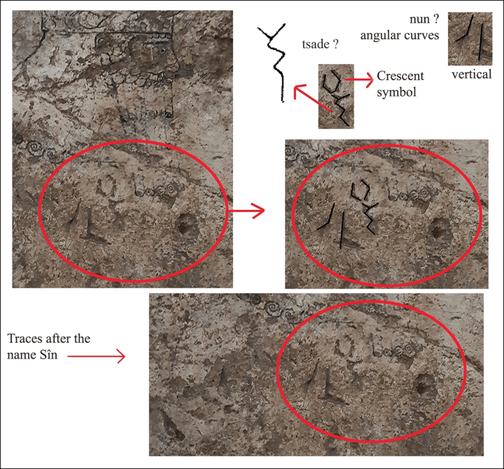 La figura n.3 porta un copricapo sormontato da una luna crescente e una luna piena. È Sin di Harran, il dio luna.