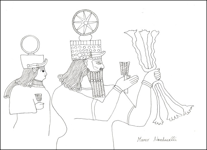 Lo stile artistico è neo-assiro, tuttavia i ricercatori hanno notato alcuni elementi di origine siro-anatolica: i copricapi di entrambi, la collana di lei, i capelli di lui e i muscoli (non evidenziati nel disegno).