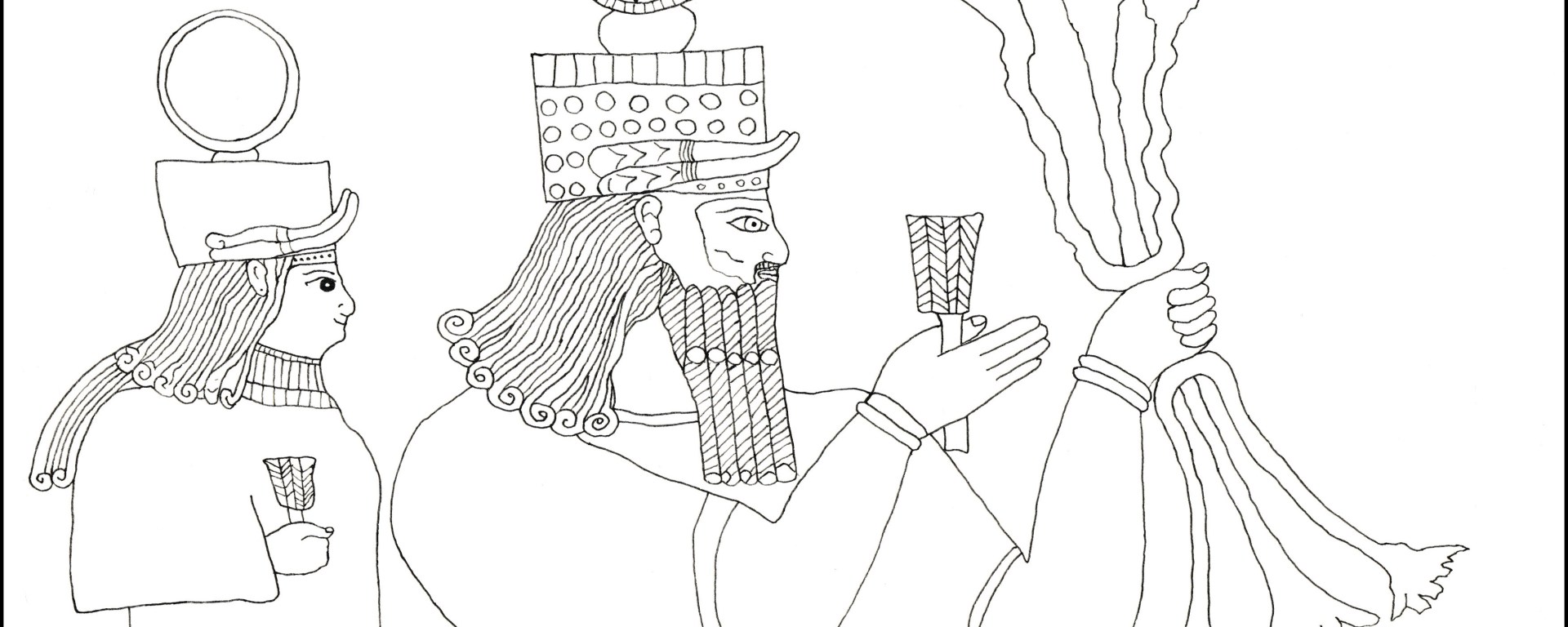 Lo stile artistico è neo-assiro, tuttavia i ricercatori hanno notato alcuni elementi di origine siro-anatolica: i copricapi di entrambi, la collana di lei, i capelli di lui e i muscoli (non evidenziati nel disegno).