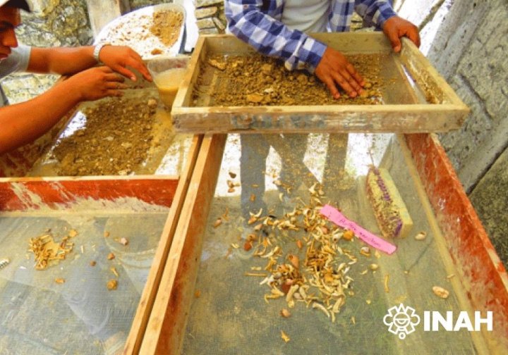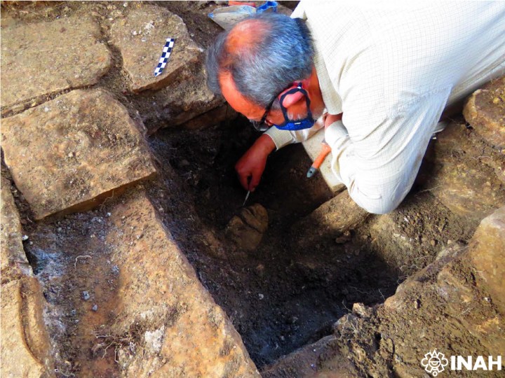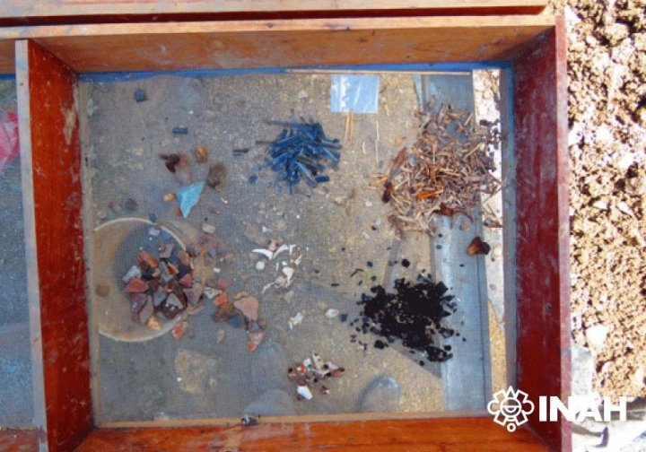 «Gli elementi erano disposti in modo concentrico e non in strati, coprendo quasi il 75% della cavità, che poi sigillarono con pietre. Alcune ossa animali erano cotte, altre avevano segni di rimozione della carne e impronte di denti, quindi venivano utilizzate per il consumo umano come parte del rituale», precisa González Cruz. Sopra l’offerta fu posta una lastra di calcare con un piccolo foro, ma non prima di “sacrificare” il piatto a tre piedi, che era stato spezzato per metà mentre una porzione con un piede fu collocato nel foro della lastra. Veniva quindi un letto semicircolare di cocci e piccole pietre, su cui era posta la testa della divinità. Infine, l’intero spazio venne chiuso con terra e tre muretti, lasciando la testa del giovane dio del mais nascosta per circa 1.300 anni.