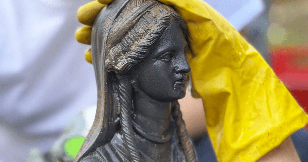Le sculture sono state rinvenute sul fondo della vasca rituale lo scorso ottobre. Le ricerche sono durate 14 settimane ma erano iniziate nel 2019, finora hanno portato al ritrovamento di oltre cinquemila monete d’oro, argento, oricalco e bronzo, oltre a numerosi reperti. Il santuario era collegato alla vasca sacra del cosiddetto Bagno Grande, detto anche Bagno Romano. I visitatori avrebbero lanciato le monete nelle vasche come gesto di buona fortuna per la loro salute.